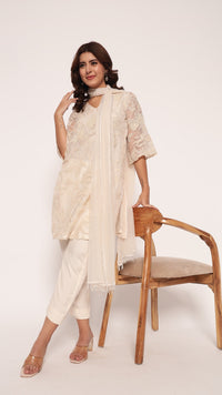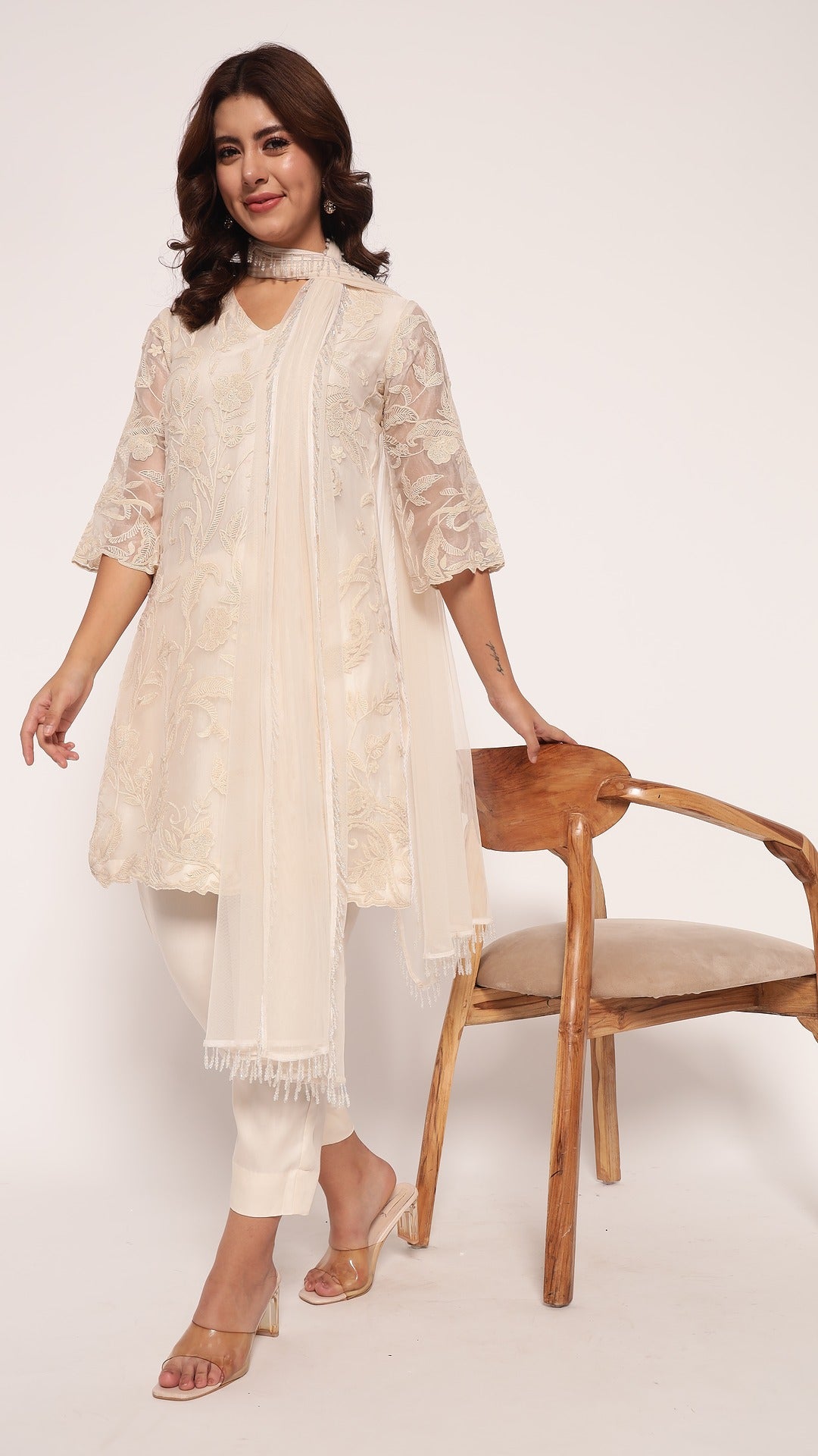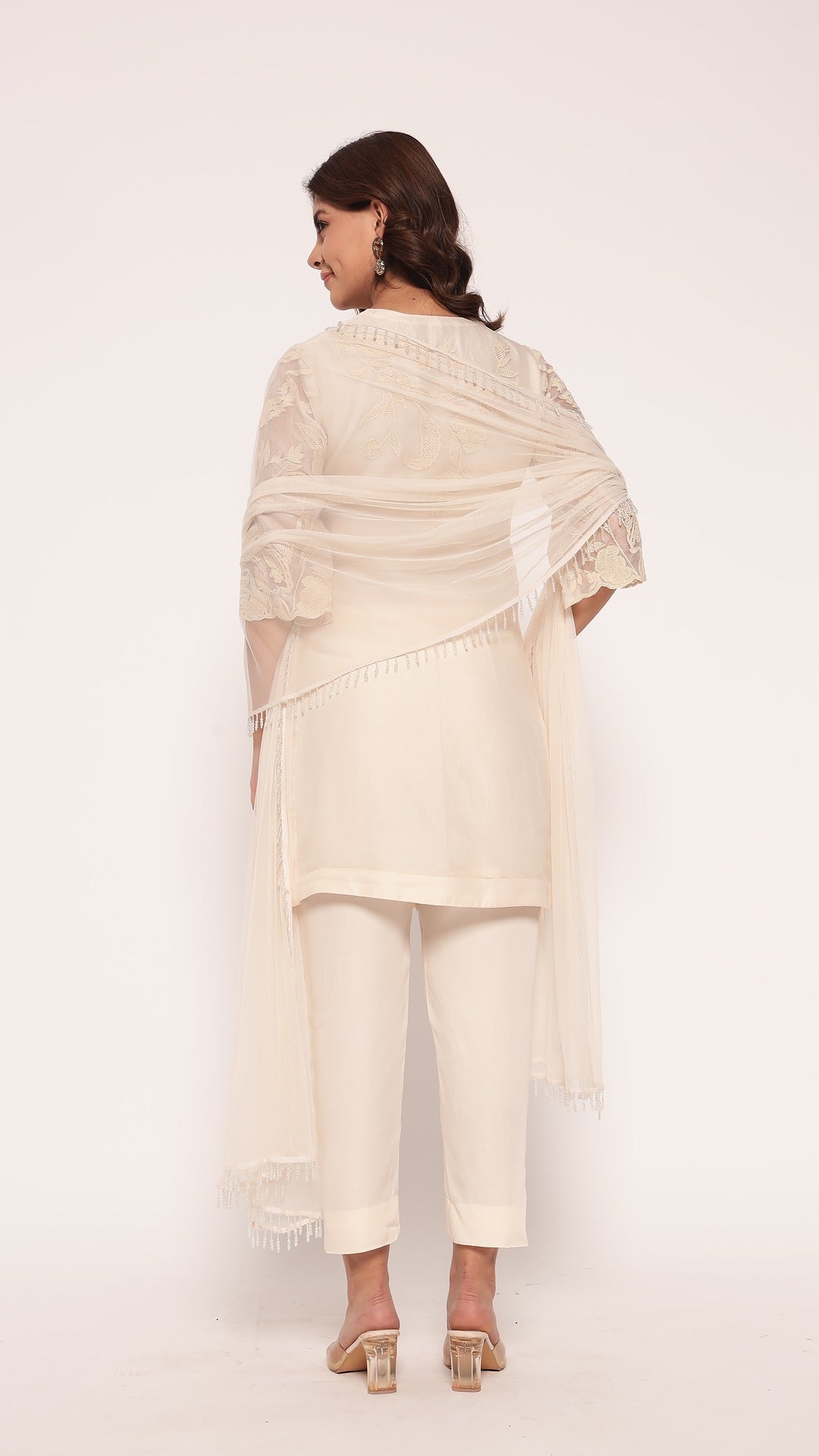 In a serene ivory hue reminiscent of the moon’s glow, this short suit features delicate floral embroidery motifs that bring timeless elegance for all age groups. The bell sleeves unfurl like soft petals, while the tailored pants provide a polished, graceful finish—blending subtle charm with contemporary ease.